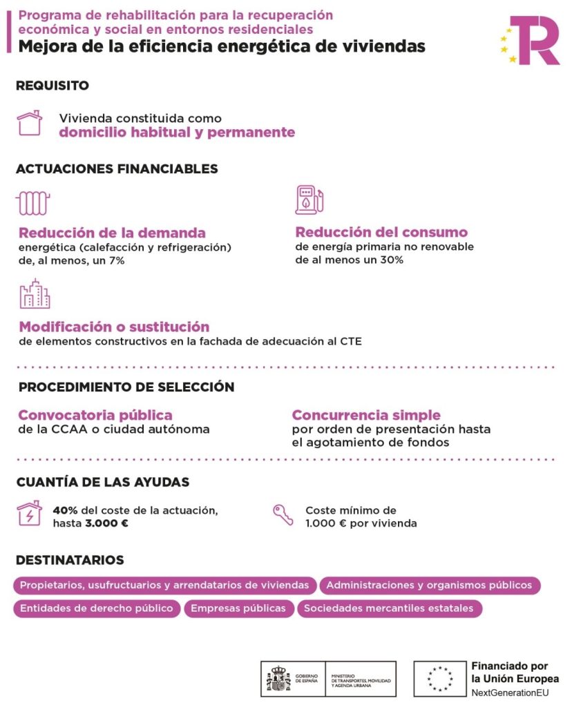Se trata de un completo programa de ayudas financiado por la Unión Europea cuyo objetivo es la reducción de la demanda energética, refrigeración y calefacción en las viviendas. ¿Te gustaría poder beneficiarte de esta ayuda pública para la mejora de la eficiencia energética en tu hogar? Podrás hacerlo siempre que la vivienda en la que quieras cambiar las ventanas sea tu domicilio habitual, independientemente de si eres el propietario, arrendatario o usufructuario.