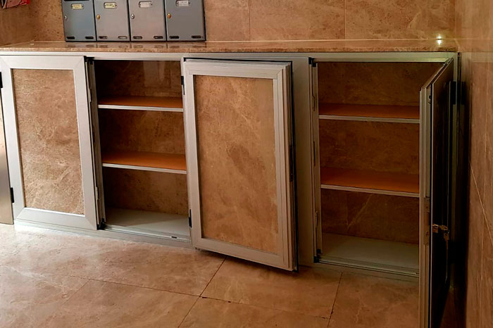 El cliente buscaba una solución para el aprovechamiento de un espacio muerto en el portal de una comunidad de vecinos. Y para ello se propuso la instalación de un armario de aluminio, el cual podría ser utilizado para el almacenaje de las pertenencias de los vecinos o para guardar el material propio del mantenimiento de la finca.