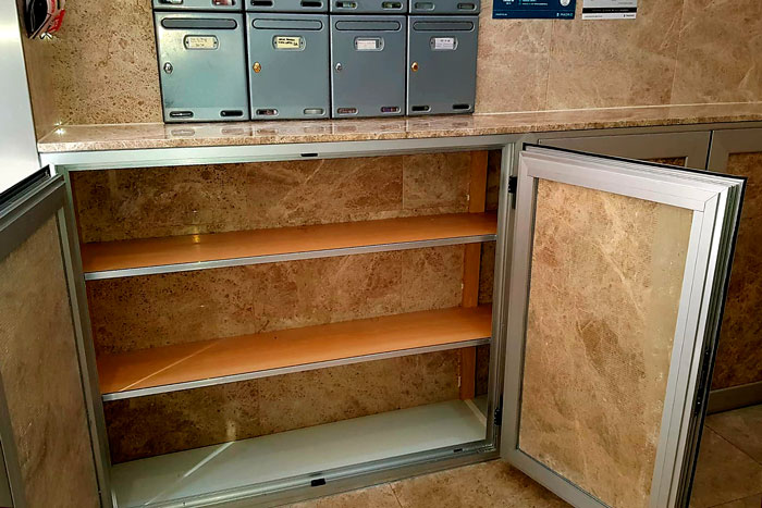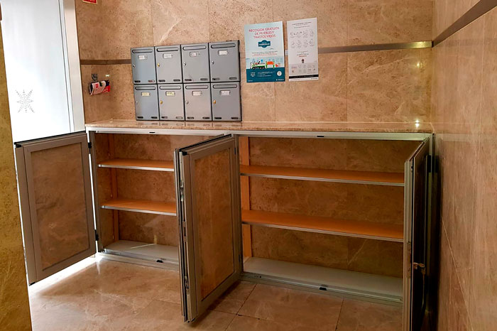 Como se puede ver en las imágenes, el resultado final es el de la colocación un armario de aluminio de gran capacidad perfectamente adaptado a la estética del portal. Esto se consiguió gracias a la incorporación de unas placas de mármol con acabado exactamente igual al presentado por las paredes. De esta manera, la integración es perfecta, siendo imposible para toda persona ajena al edificio percibir que el armario es una incorporación posterior.